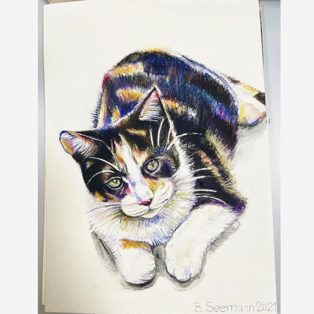 Miezekatze-Aquarell mit wasservermalbaren Stiften auf DIN A4 Aquarellpapier gezeichnet.